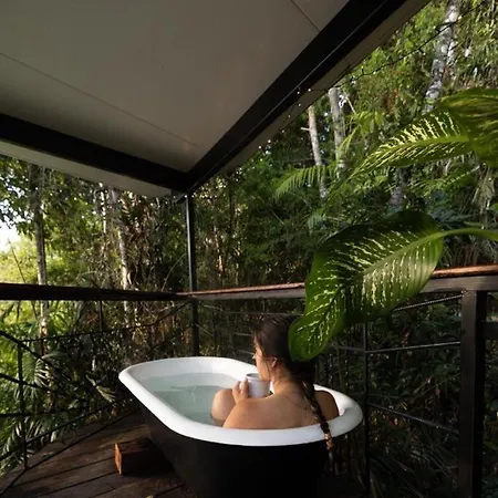 Tijdens een verblijf in Sun Suite - Tiny Home Treehouse Kuranda van 40 m² kunnen gasten zich ontspannen op een terras op ongeveer 3 km van Australian Venom Zoo.